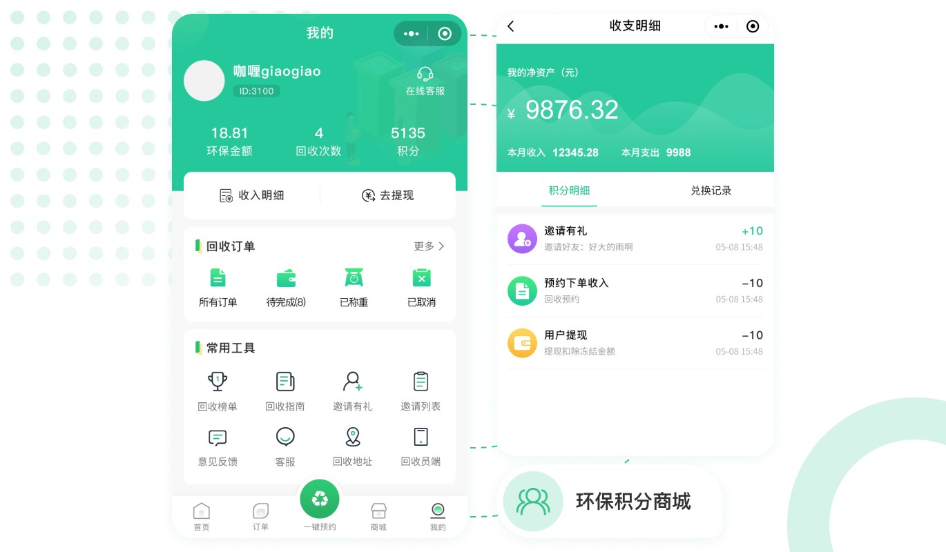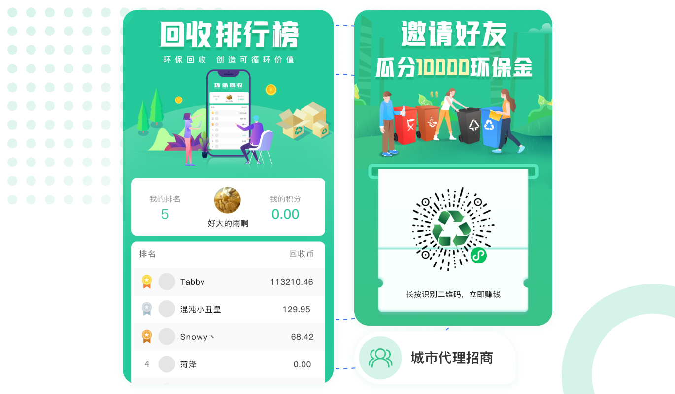 麥芒環?;厥战鉀Q方案:用戶通過小程序下單、系統自動分單、回收員上門回收、線上結算打款等幫助回收行業互聯網+,實現廢品回收數互聯網轉型,為環保事業做貢獻。